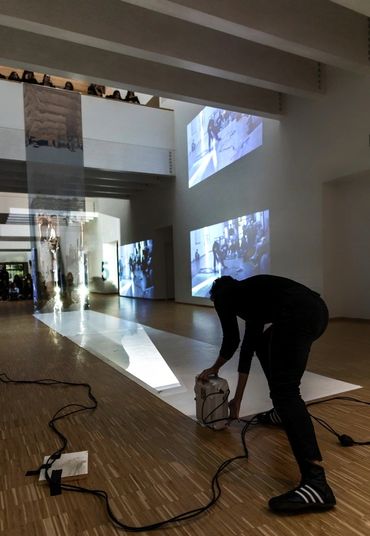 Installazione site-specific: 4 altoparlanti, 1 videocamera/webcam in live streaming; 3 proiettori 4K ad alta risoluzione posizionati a un'altezza variabile, su diversi piani, angolazioni e prospettiche; videoproiezioni proiettate dal performer a 360 gradi su suolo-corpo-parete-fondale-soffitto; 1 Telo riflettente semi-trasparente 1,20x8metri; 1 rotolo di tappeto danza-linoleum bianco/nero lucido 1,20x6 metri.